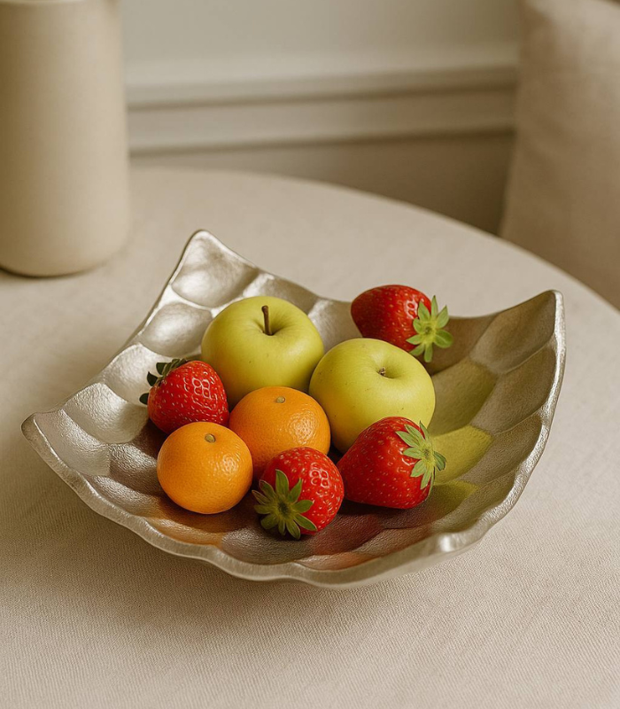 بدنهی این میوهخوری از آلومینیوم آبکاریشده ساخته شده است. فرآیند آبکاری باعث درخشندگی خیرهکننده و سطحی براق میشود که علاوه بر زیبایی، مقاومت بالایی در برابر خط و خش و تغییر رنگ دارد. این ویژگی باعث میشود محصول برای استفاده روزمره یا پذیراییهای خاص همیشه جلوهای نو و چشمگیر داشته باشد. طراحی چهارگوش مدرن آن نیز به سادگی با سایر ظروف پذیرایی ترکیب میشود و چیدمانی هماهنگ و شیک روی میز ایجاد میکند.